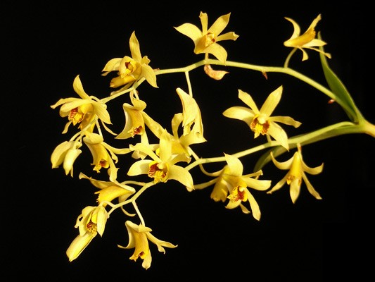 เป็นกล้วยไม้อิงอาศัย เป็นลำรูปไข่ รูปไข่แกมรีหรือรูปรี มีลำลูกกล้วยสั้นกว่า มีความยาว 5-6 เซนติเมตร เรียงชิดกัน สามารถพบได้กว้างเกือบทุกภาคของไทย รวมถึงประเทศในคาบสมุทรอินโดจีน กล้วยไม้ชนิดนี้จะไม่พบในภาคใต้ของไทยและแหลมมาเลเซีย ขนาด 2-4×1-1.5 เซนติเมตร ขึ้นเป็นกอหรือเป็นกระจุก ใบลักษณะบาง รูปใบหอก ขนาด 3-4×1.2-1.5 เซนติเมตร ใบร่วงแล้วจึงแทงช่อดอก ดอกออกเป็นช่อ15-20 ดอก กลีบดอกสีเหลืองอมเขียวอ่อน กลีบปากใหญ่ ขอบด้านปลายฉีกเป็นริ้วยาว สีเหลืองอมน้ำตาล มีเส้นสีน้ำตาลตามความยาวกลีบทางช่วงปลาย ดอกขนาด 2-2.5 เซนติเมตร ออกดอกเดือนเมษายน - มิถุนายน ชื่ออื่น ๆ เอื้องข้าวเหนียวลิง