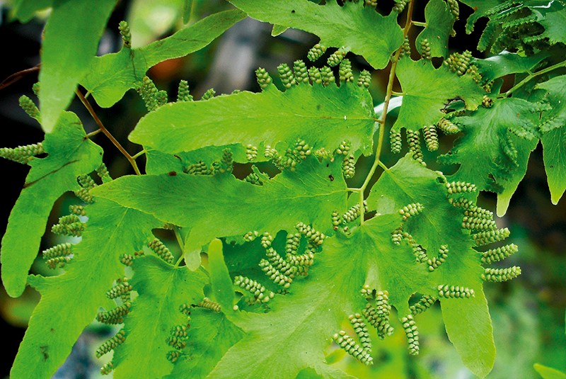 ส่วนท้องใบมีขนขึ้นประปรายตามเส้นใบ ส่วนใบย่อยที่สร้างสปอร์ที่อยู่กลางเถาขึ้นไปนั้น