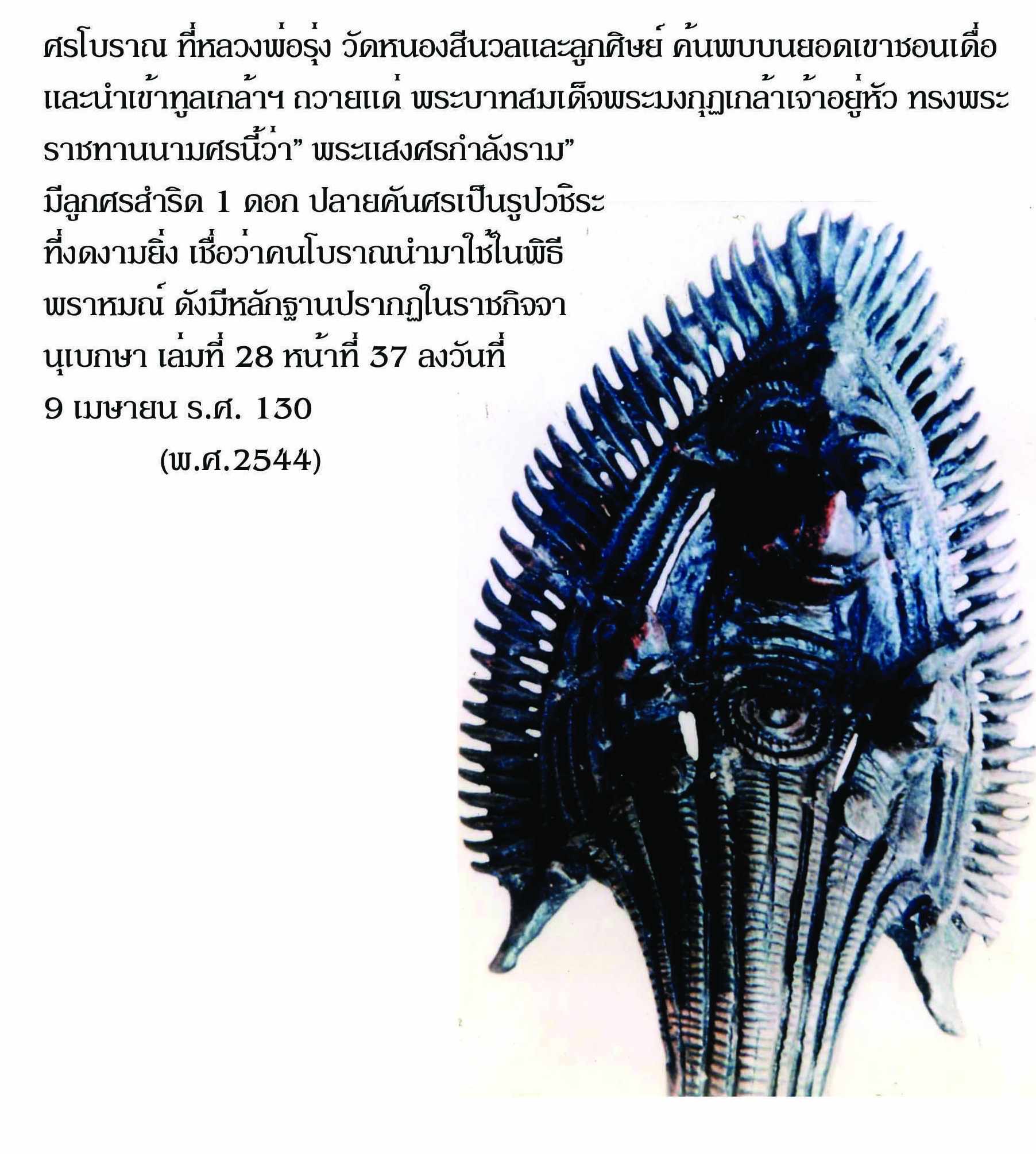 “การที่ได้แผ่นสัมฤทธิ์รูปกระบี่ธุช ครุฑพ่าห์จากนครไชยศรีซึ่งได้ให้ประกอบเปนธงกระบี่ธุช ครุฑพ่าห์ขึ้นแล้วนั้นอย่าง 1 กับการที่ได้ศรนี้อีกอย่าง 1 ทำให้หม่อมฉันรู้สึกปลื้ม อิ่มใจเปนอย่างยิ่ง รู้สึกว่าคล้าย ๆ ได้ช้างเผือก เปนอันเข้าใจดีว่าพระราชหฤทัยพระราชาธิบดีแต่ก่อน ๆ มาท่านจะทรงรู้สึกอย่างไร เมื่อมีช้างเผือกเพราะรู้อยู่ว่านับวันนั้นจะหายาก เข้าทุกที ได้เคยนึกเสียดายตงิด ๆ นี่ก็นับว่าเปนโชคดี เปนบุญนักหนาที่ได้ของสำคัญ ๆ เช่น กระบี่ธุช ครุฑพ่าห์ และศรโบราณนี้มาภายใน ปีต้นแห่งรัชสมัย นับเปนสวัสดีมงคล แก่ตัวหม่อมฉันและพระราชบรมวงษ์จักรี ทั้งสยามรัฐสีมาประชาชนที่หม่อมฉันนี้ได้รับภารเปนผู้ทำนุบำรุง ดูเหมือนมาเปนเครื่องเตือนใจให้รู้สึกหน้าที่ของตน ที่จะต้องแผ่อาณาแก่ประชาชนทั้งหลายในสยามรัฐ และจะต้องทำนุบำรุงให้ชาติดำเนินไปสู่ ความเจริญรุ่งเรืองยิ่งขึ้นให้ราษฎรได้รับความร่มเย็นเปนศุขทั่วกัน ให้ได้คงเปนใหญ่อยู่จริงสมนามแห่งชาติเรานี้ชั่วกัลปาวสาน”