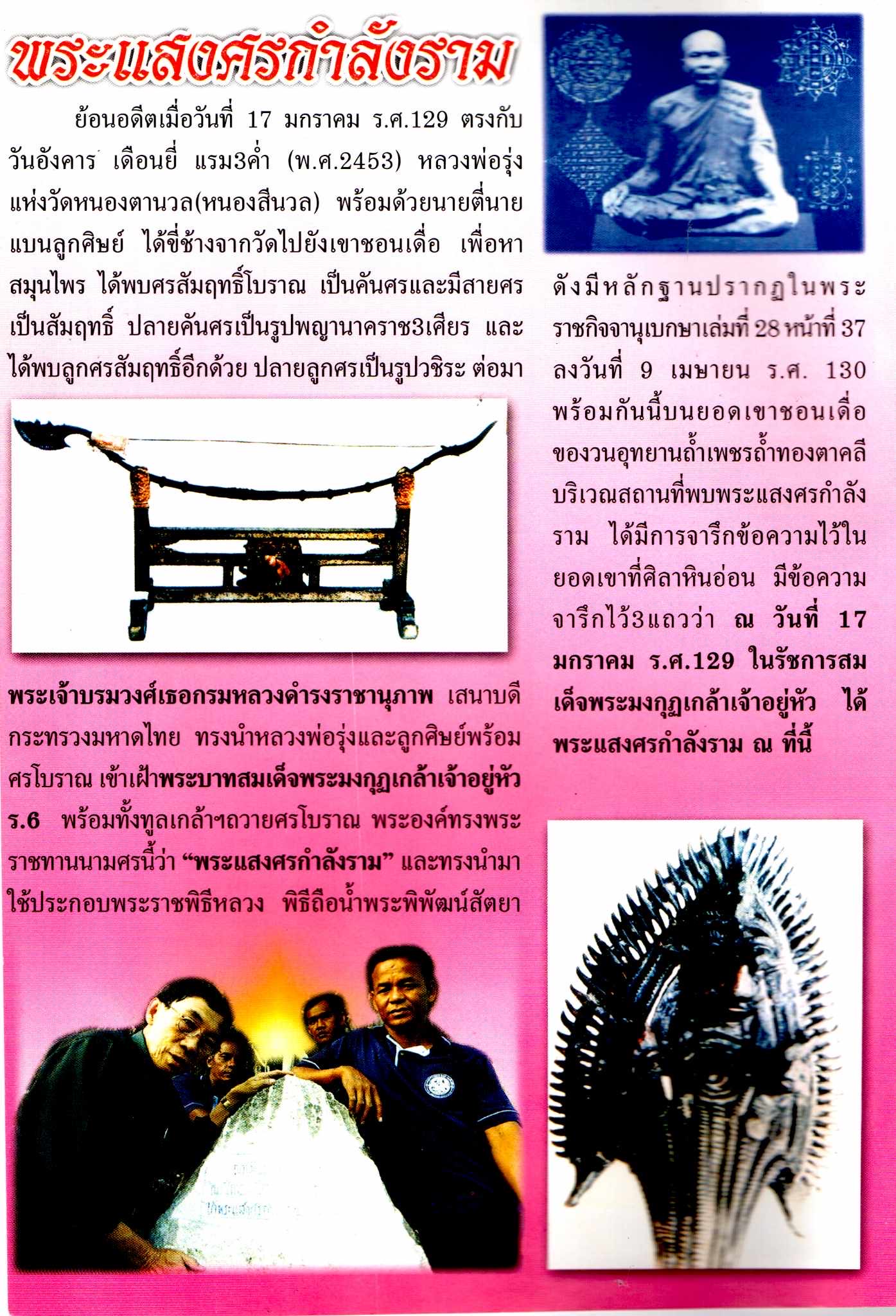 ย้อนอดีตเมื่อวันที่ 17 มกราคม ร.ศ. 129 ตรงกับวันอังคาร เดือนยี่ แรม 3 ค่ำ (พ.ศ. 2453) หลวงพ่อรุ่ง แห่งวัดหนองตานวล (หนองสีนวล) อำเภอตาคลี จังหวัดนครสวรรค์ พร้อมด้วยนายตี่ และนายแบนลูกศิษย์ ได้ขี่ช้างจากวัดไปยังเขาชอนเดื่อ เพื่อหาสมุนไพร ได้พบศรสัมฤทธิ์โบราณ มีรูปลักษณะเป็นคันศร และ มีสายศรเป็นสัมฤทธิ์ ปลายคันศรเป็นรูปพญานาคราช 3 เศียร และได้พบลูกศรสัมฤทธิ์อีกด้วย ปลายลูกศร เป็นรูปวชิระ ต่อมาพระเจ้าบรมวงศ์เธอกรมหลวงดำรงราชานุภาพ เสนาบดีกระทรวงมหาดไทย ทรงนำหลวงพ่อรุ่งและลูกศิษย์พร้อมศรโบราณ เข้าเฝ้าพระบาทสมเด็จพระมงกุฎเกล้าเจ้าอยู่หัว (รัชกาลที่ 6) พร้อมทั้งทูลเกล้าฯ ถวายศรโบราณ พระองค์ทรงพระราชทานนามศรนี้ว่า “พระแสงศรกำลังราม” และทรงนำมาใช้การประกอบพระราชพิธีหลวง พิธีถือน้ำพิพัฒน์สัตยา ดังมีหลักฐานปรากฏใน พระราชกิจจานุเบกษา เล่มที่ 28 หน้าที่ 37 ลงวันที่ 9 เมษายน ร.ศ. 130 พร้อมกันนี้บนยอดเขาชอนเดื่อ ของวนอุทยานถ้ำเพชร – ถ้ำทอง ยังพบการจารึกข้อความไว้บนศิลาหินอ่อน มีข้อความไว้ 3 แถว ระบุ ณ วันที่ 17 มกราคม ร.ศ. 129 ในรัชกาลสมเด็จพระมงกุฎเกล้าเจ้าอยู่หัว ได้พระแสงศรกำลังราม ณ ที่นี้